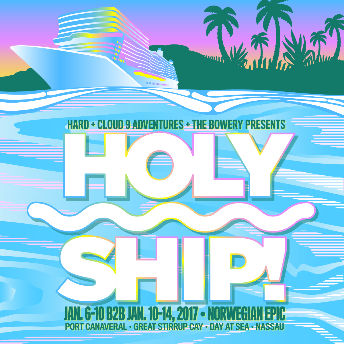 Shipfam and landfam your prayers have been answered and HOLY SHIP! 2017 has been announced. The eighth and ninth editions of the cruise expand to four-nights with B2B itineraries on January 6-10 and January 10-14, 2017. Aboard their new home the Norwegian Cruise Line “Epic,” you can expect the genres’ foremost talent, exhilarating pool parties, artist-led activities, theme nights, surprise artist collaborations, and a whole lot of good vibes.