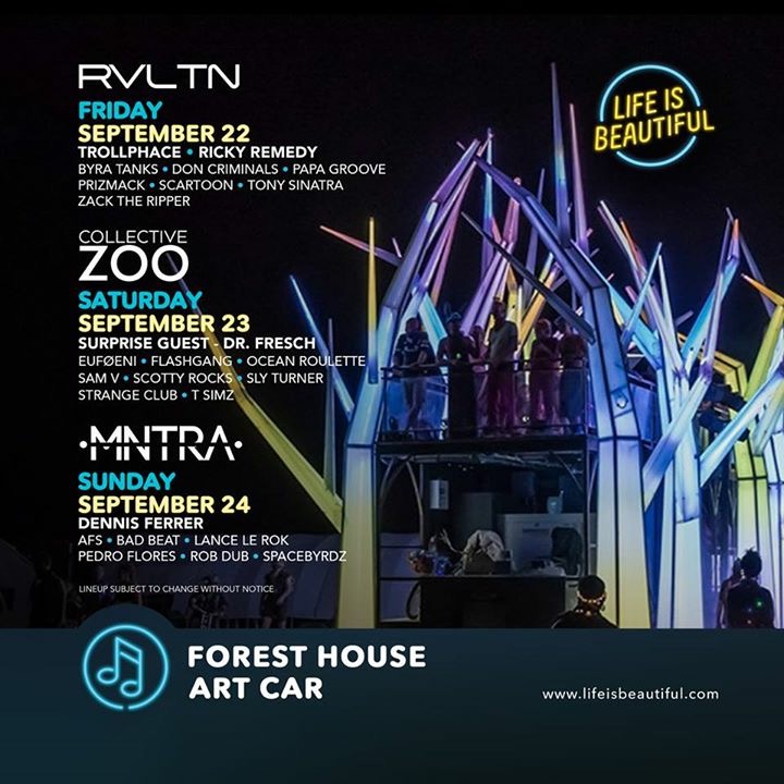 Showcased for the first time at Burning Man, Forest House was built on a school bus and features 30,000 LEDs. It is an electrified car encased in glowing neon trees (not the band, actual trees)! On September 22, Trollphace and Rick Remedy will be spinning some hard-hitting sets. Then on September 23, Collective Zoo will be hosting the party ship with a surprise guest and Dr. Fresch. Finally, on September 24, the underground house collective MNTRA will close out the weekend.