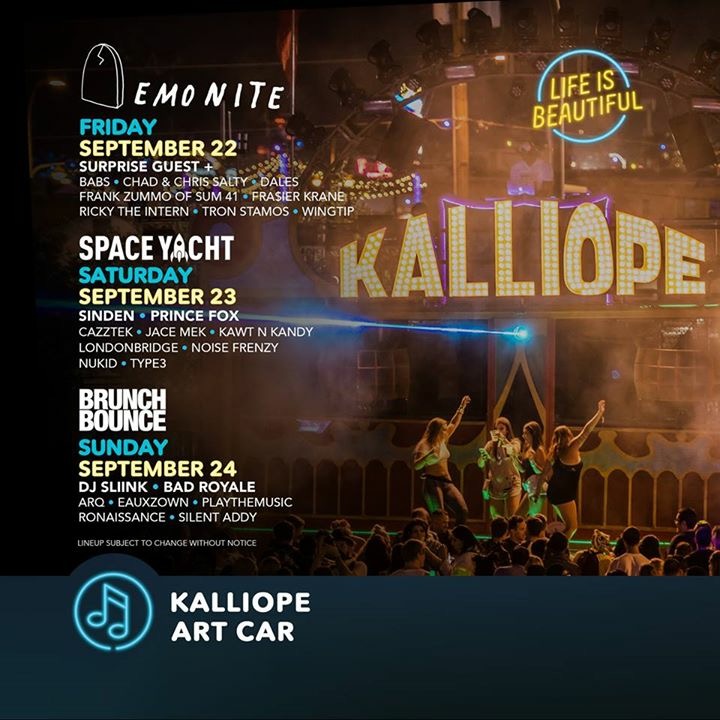 The circus-inspired Kalliope Art Car is no stranger to music festivals. The car has seen its share of festivals, including last year’s Life is Beautiful, Burning Man, Bonnaroo, and the Electronic Daisy Carnival. The first night on September 22 will be hosted by Emo Nite. DJs will spin the music of pop-punk artists who wear too-skinny-for-comfort-jeans. Of course, if you don’t get enough Emo Nite that night, you can always check out their hosted events happening all over the strip: Brooklyn Bowl, The Linq Promenade, and the House of Blues inside Mandalay Bay.