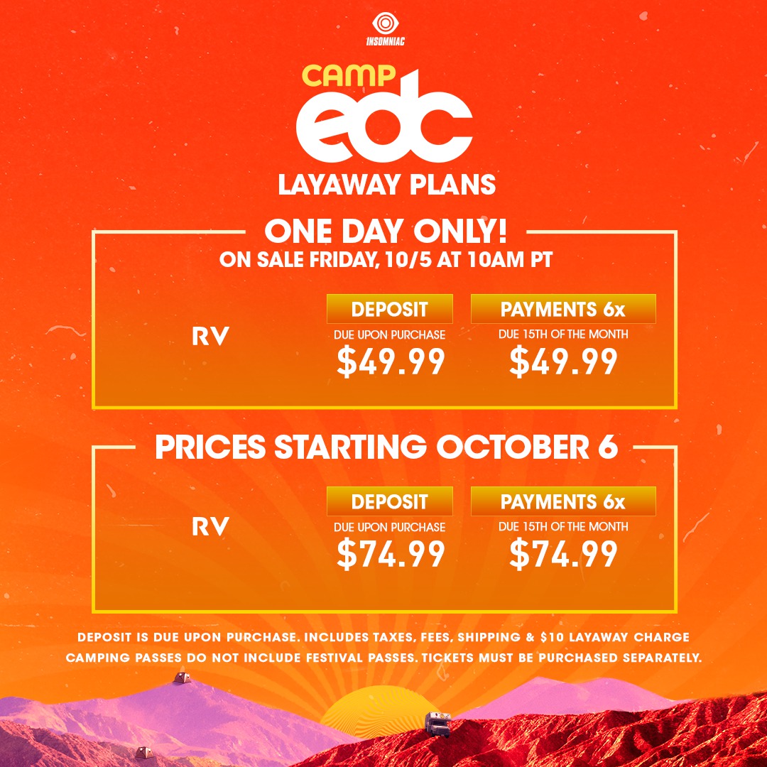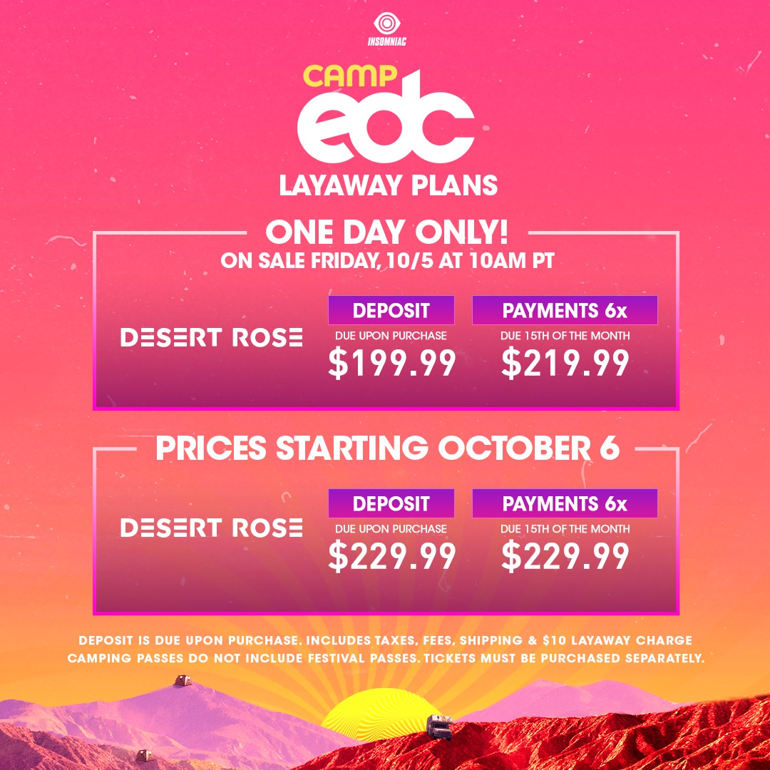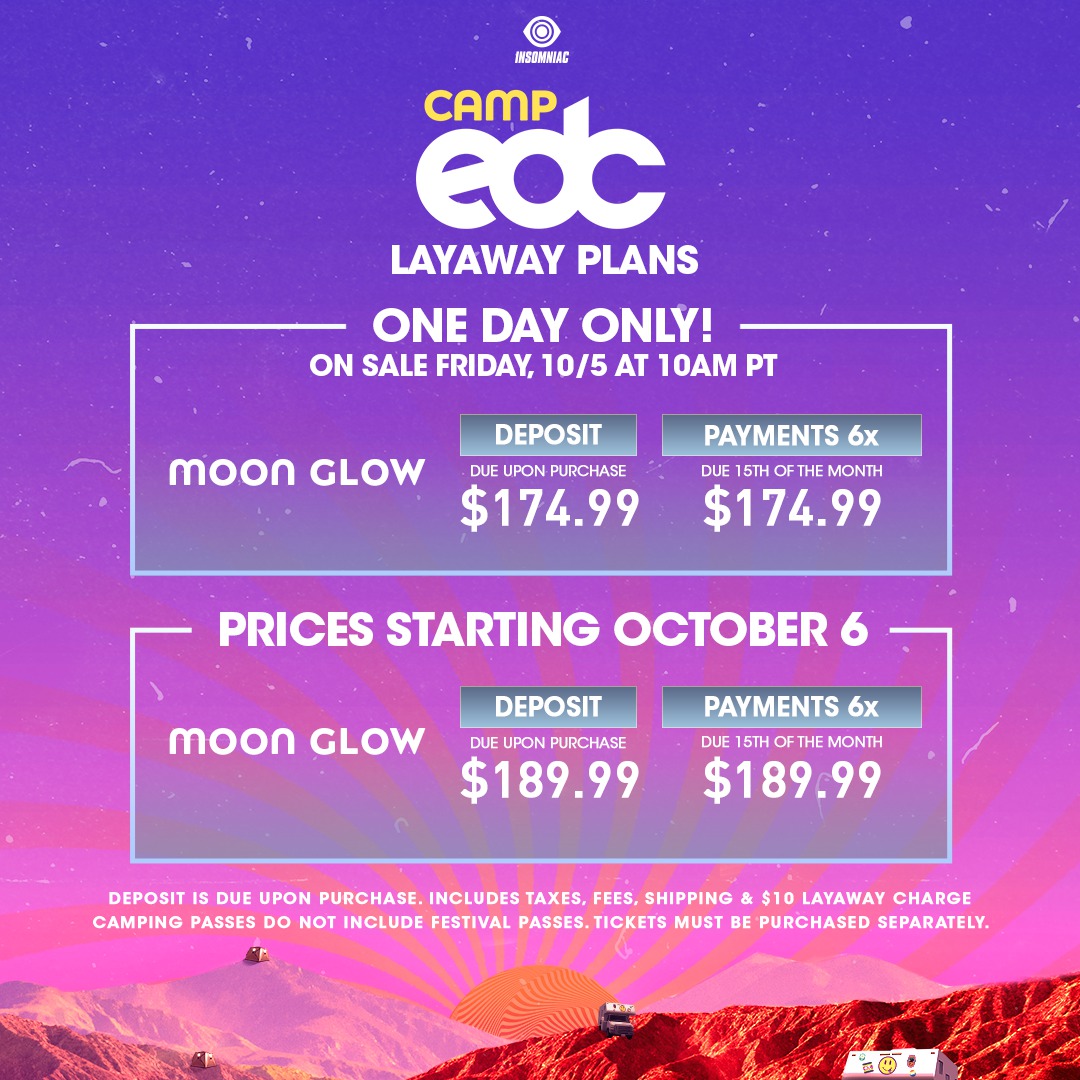 Camp EDC goes on sale Friday, October 5 at 10am PT via FrontGate Tickets. Make sure to grab your passes that day if possible to lock in the lowest price as they will increase on October 6! Camping packages start at $999 for Moon Glow, $1,299 for Desert Rose, and $279 for RV Camping, with layaway plans and additional options or upgrades available.