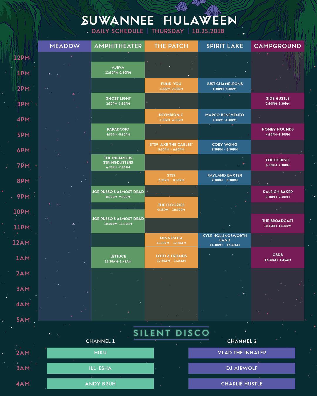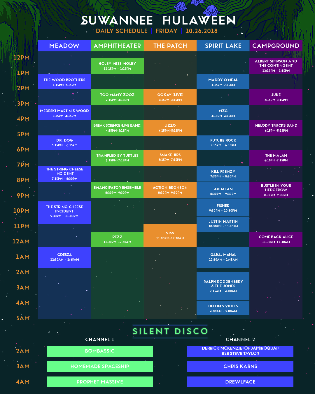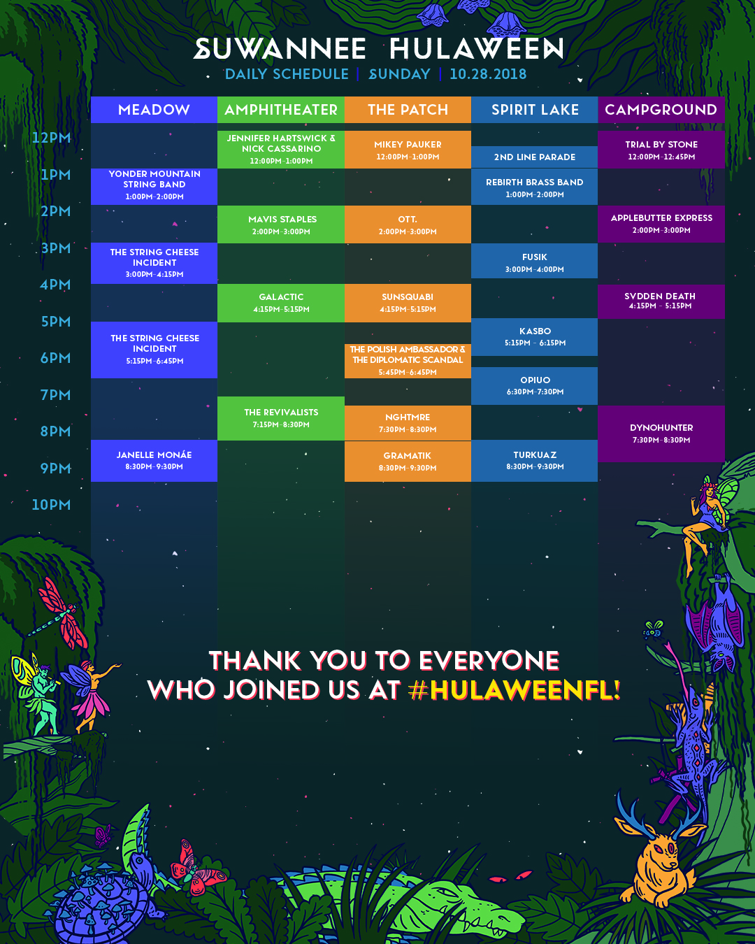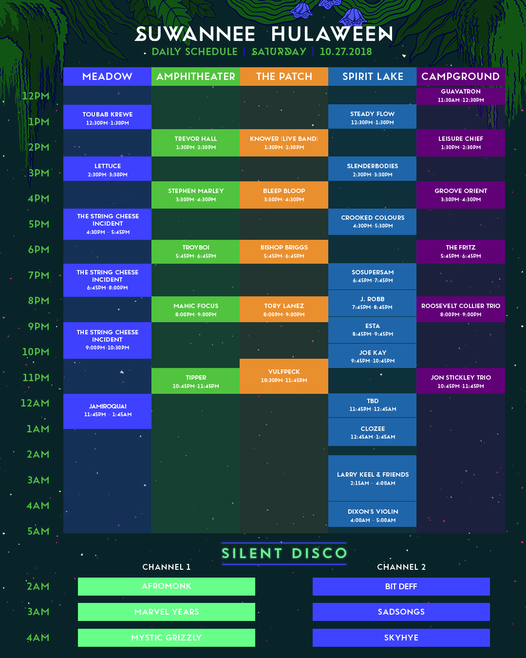 While we’ve continued to scour the lineup in the lead up to the festival to give you our top picks, and a ghoulishly good playlist for you to bump on the way to Spirit of Suwannee Camp Grounds, it is now time to begin making some final preparations for the festival. Now, with Hulaween just a week away, we’ve compiled some of the most essential info for you and your crew to be in the know ahead of the show!