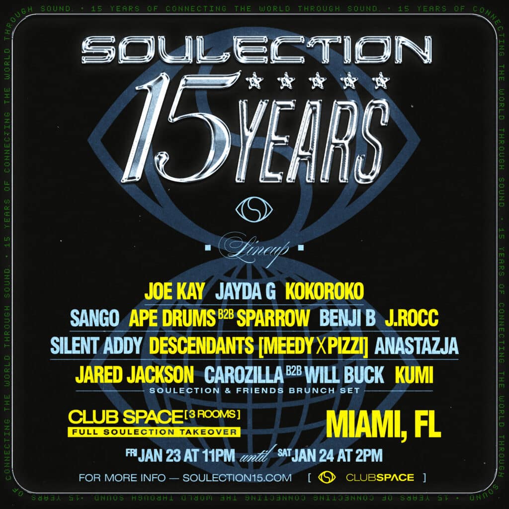 In even more recent news, the promoter team has officially released the event’s highly anticipated artist lineup. Headlined by label founder and creative visionary Joe Kay, Soulection: 15 Years has tapped the likes of founding member Sango, Jayda G, Kokoroko, Benji B, J Rocc, and Ape Drums b2b Sparrow, among others, to take charge over 15 hours of nonstop music across three rooms.
