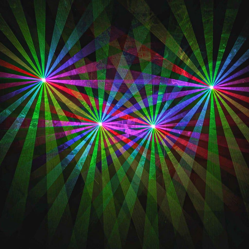 High-powered lasers are gonna be your “big and bright.” You’re usually using between 20-watt and 45 to 60-watt lasers. Think outdoor shows. Indoor shows are now starting to use high-powered units. So they’re very bright, very sharp beams. They light up the room.