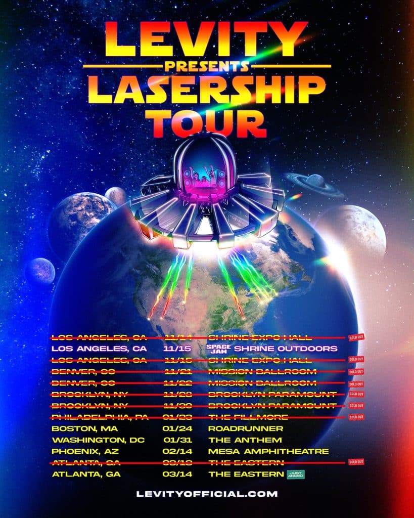 As lasershow designer for Levity and the co-owner of Florida’s EyeKandi Laser Productions, his expertise is on full display during the rising Chicago dubstep trio’s latest tour, LASERSHIP. The mind-blowing, 90-minute odyssey features a full-sized UFO, giant bursts of colored pyro, and about 80% of the firepower Gareth Emery packed into arenas for his LSR:CITY tour — all in venues about one-third the size.